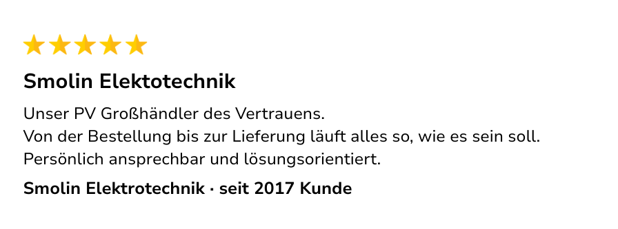 Unsere Kunden sind Fachbetriebe, die regelmäßig PV-Komplettanlagen umsetzen. Die Rückmeldungen zeigen, was in der Zusammenarbeit besonders geschätzt wird. Google Kundenbewertungen von Fachbetrieben
